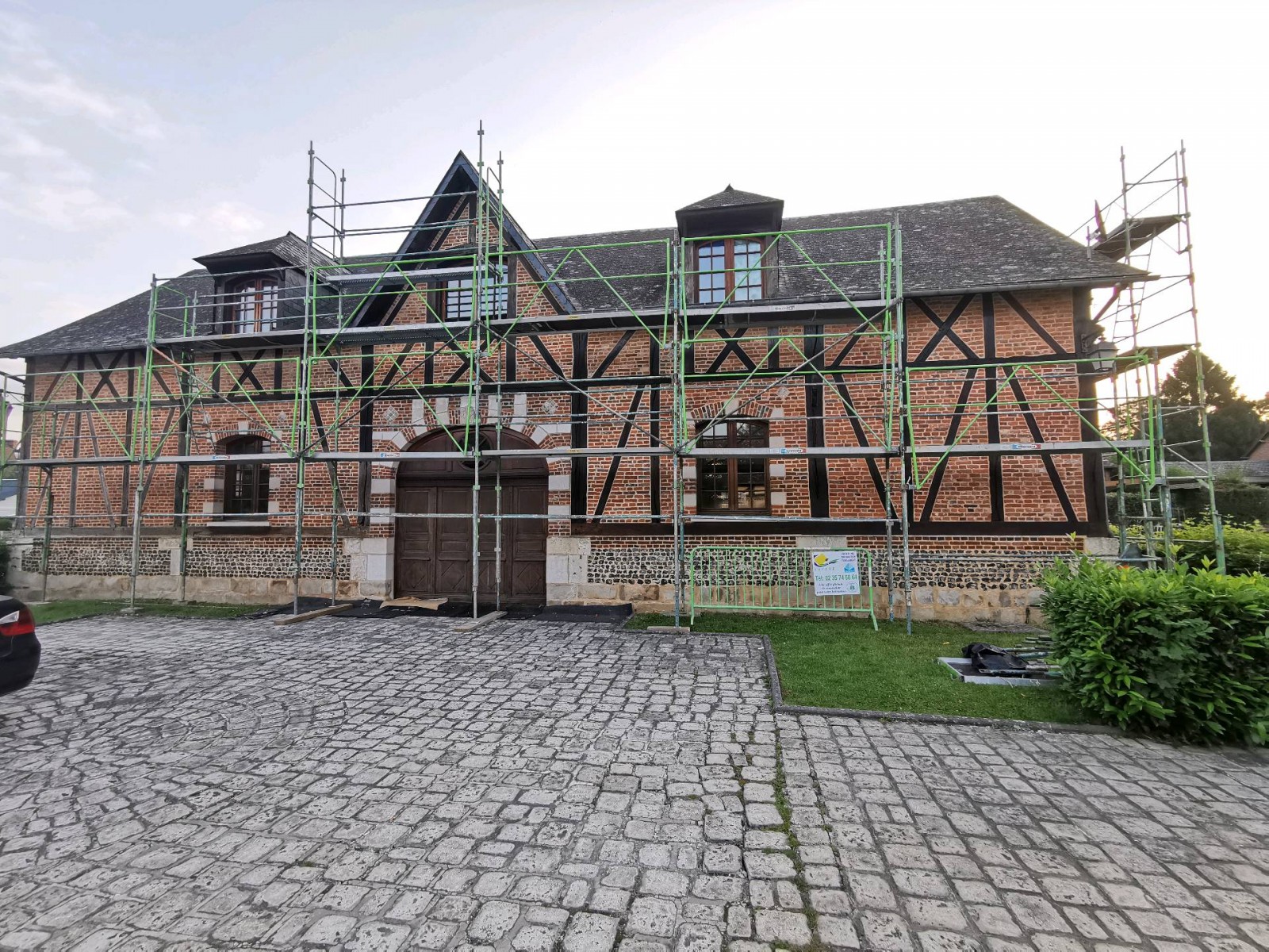 Démarrage d'un chantier de ravalementextérieur en colombage sur la commune de RY 76, montage des échafaudages, lessivage et brossage des colombages, application de 3 couches lasure Sikkens filter 7.