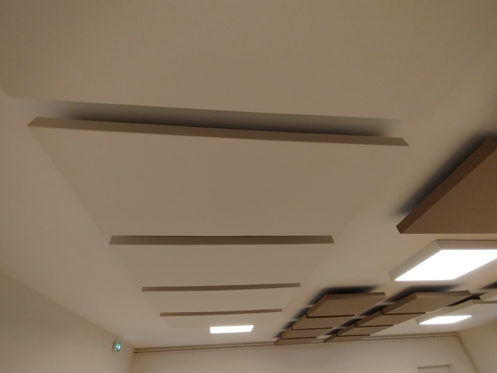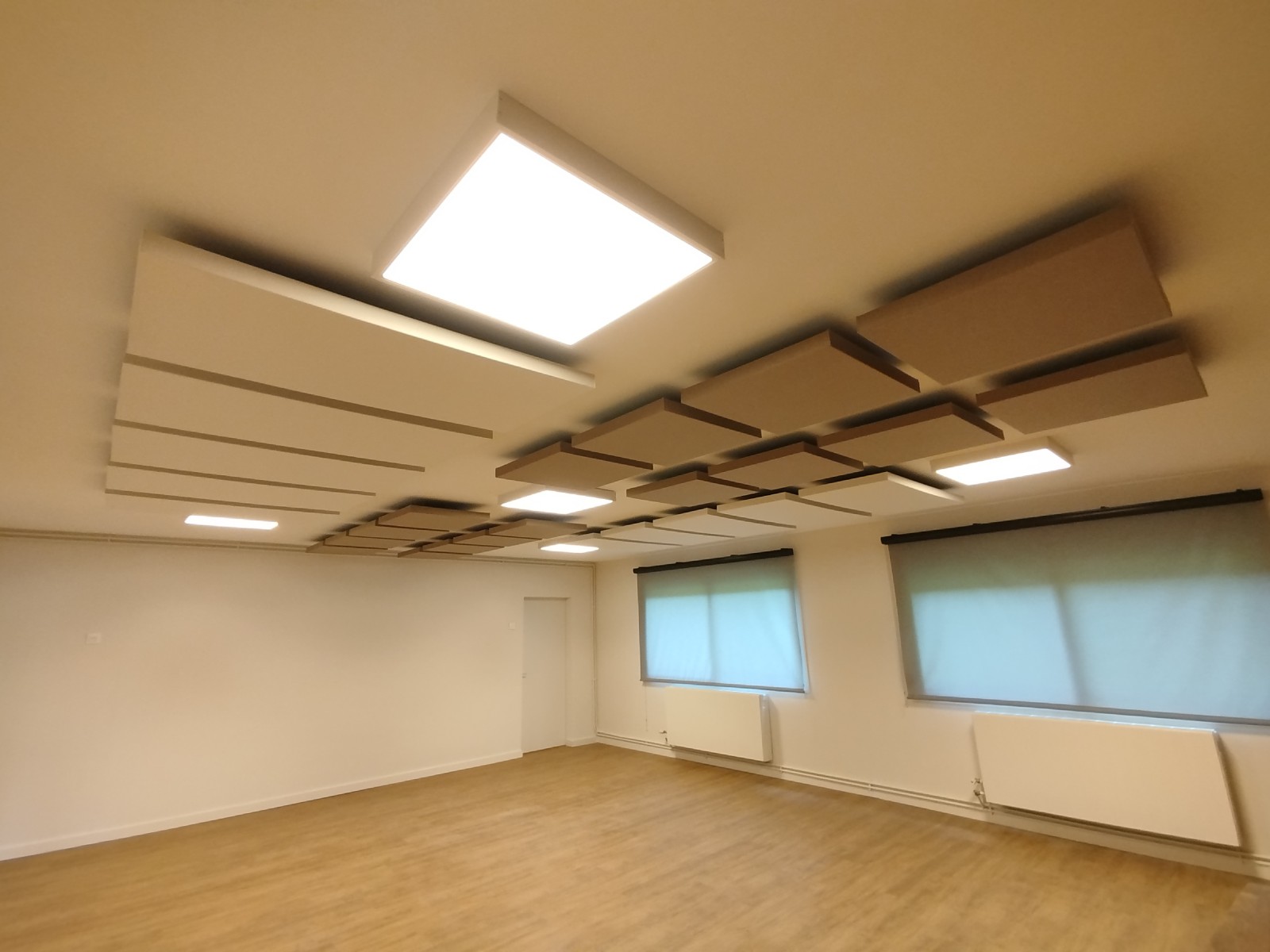 Pour abaisser la résonance d'une salle de réunion et aussi salle des mariages nous avons posé des dalles acoustiques réduisant considérablement le niveau sonore, plus familièrement surnommé le brouhaha.