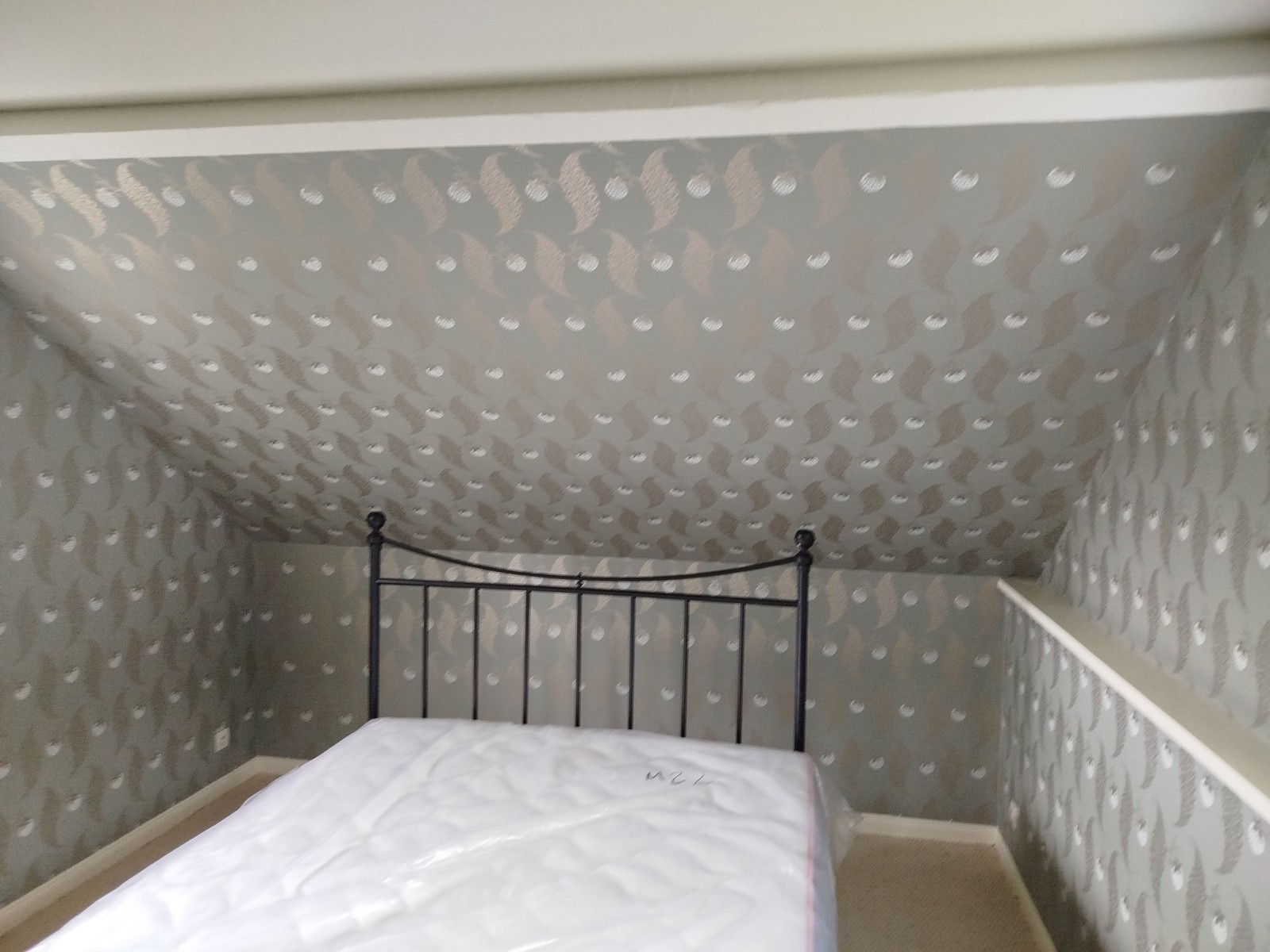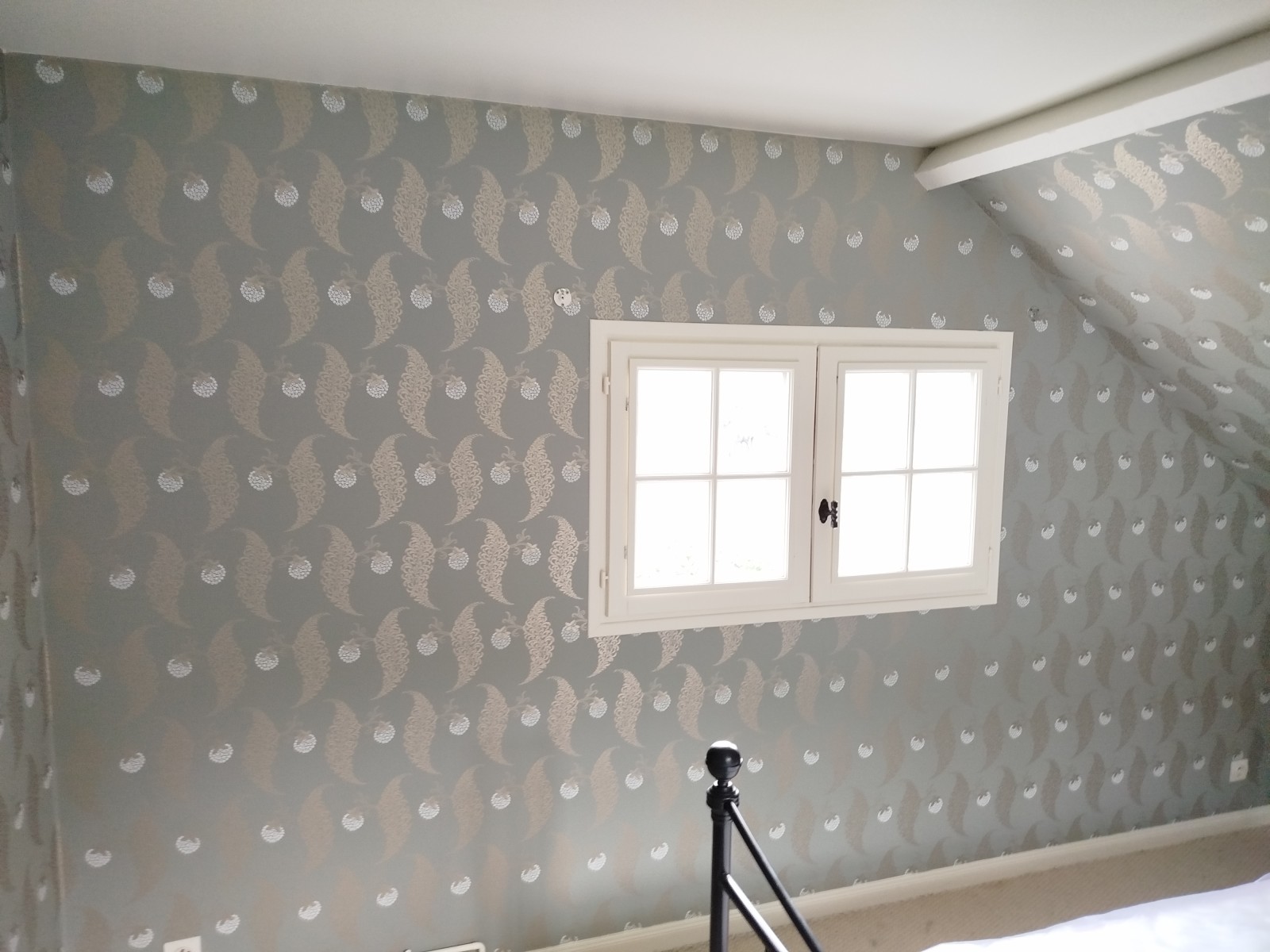Préparation des murs par un lessivage un rebouchage, ponçage,pose de papier peint déco de chez FARROW & BALL, papier peint artisanaux fait main.