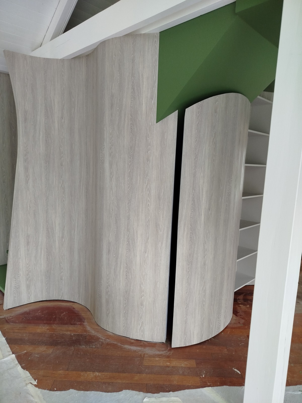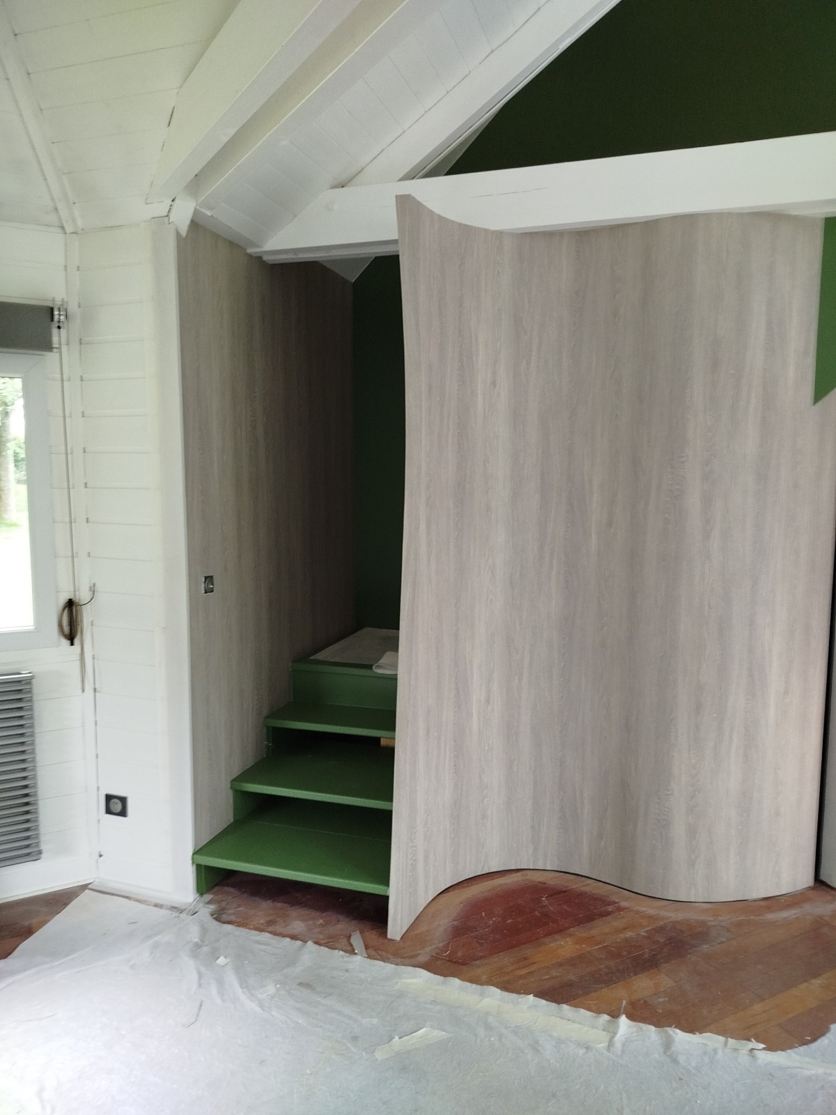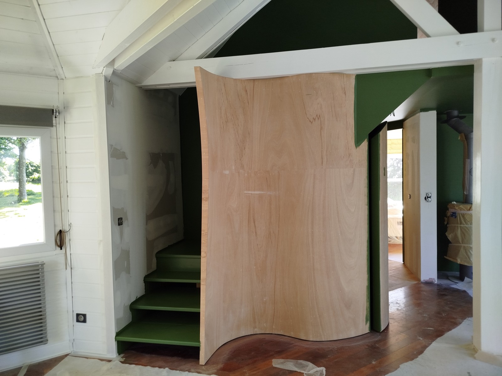 Pour commencer nous avons protégé le parquet existant, application d'une impression glycéro sur bois neuf, ponçage léger, pose coller d'un revêtement mural ÉLITIS Essences des bois, 318gr en 1m20 de large avec colle spéciale et coupes doubles pour les raccords.