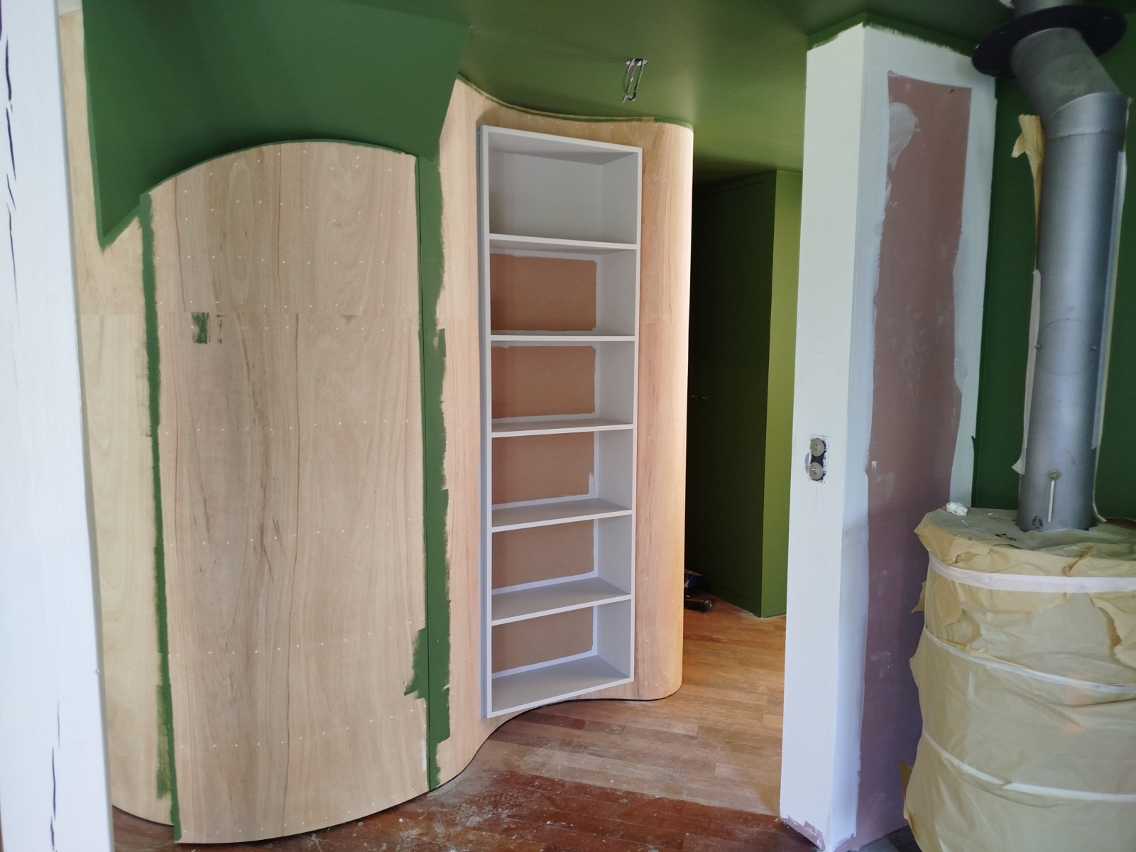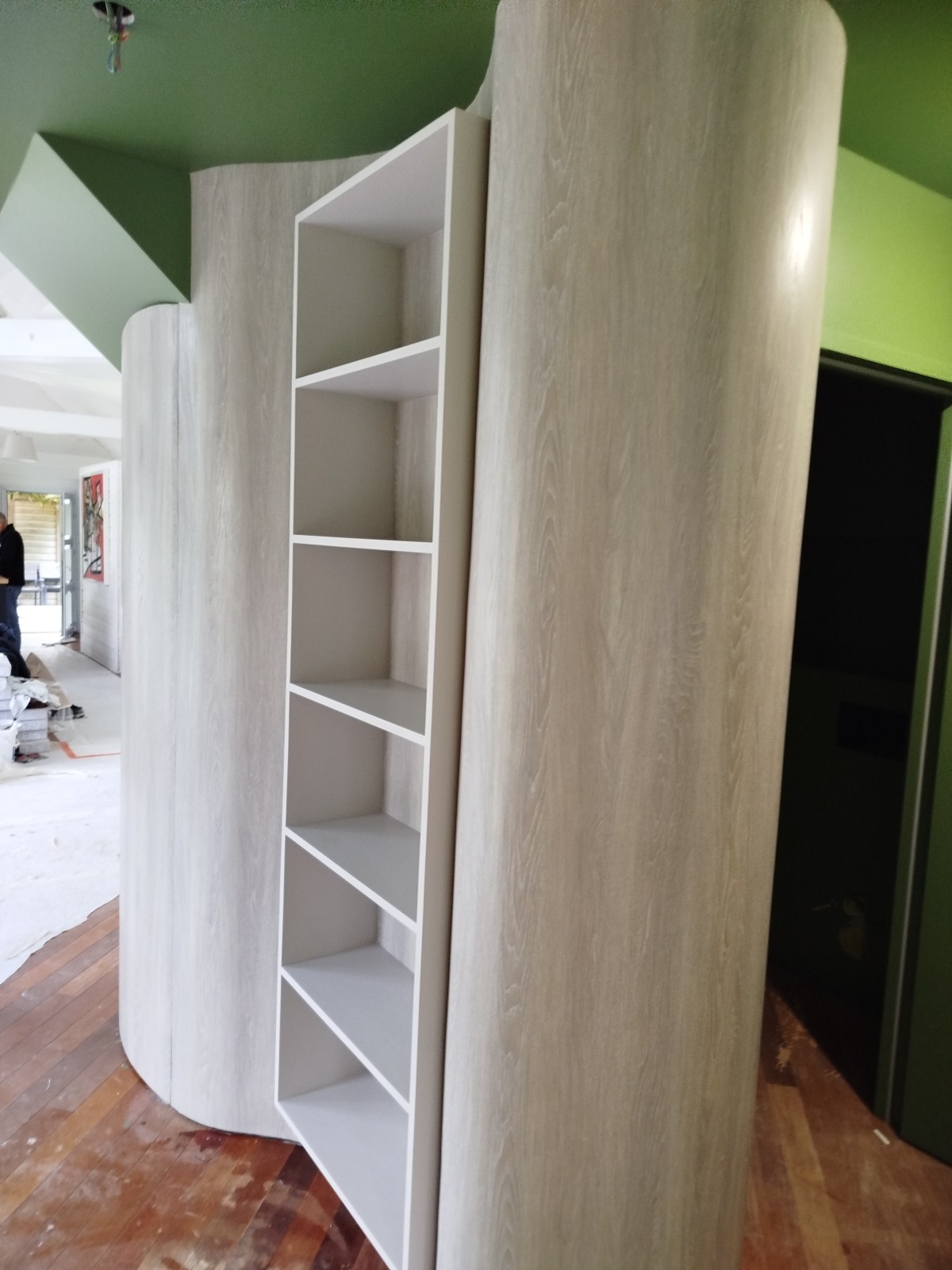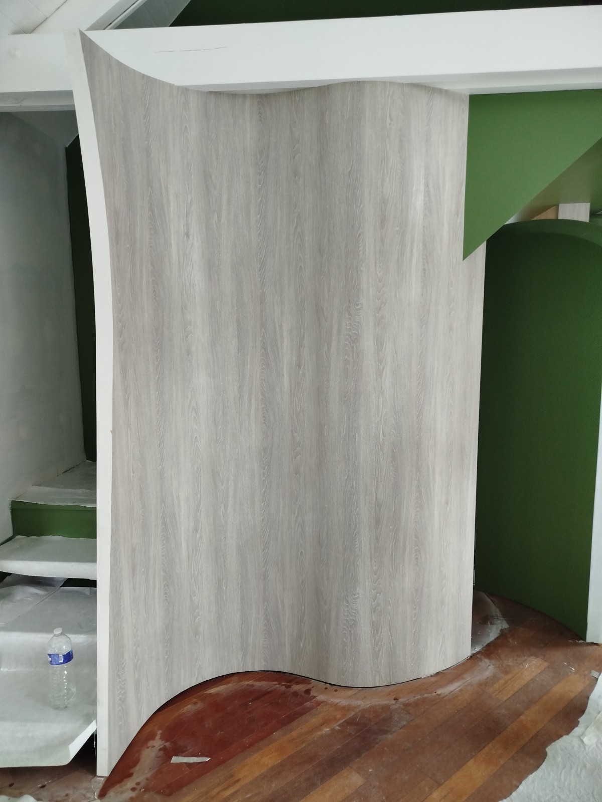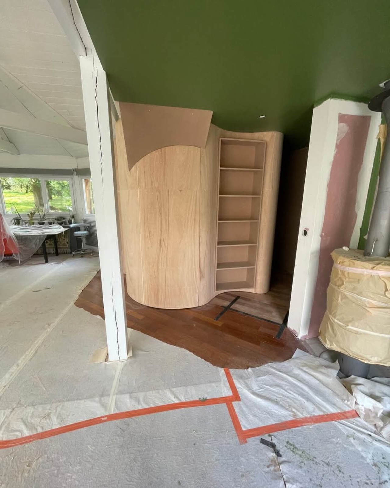 Pour commencer nous avons protégé le parquet existant, application d'une impression glycéro sur bois neuf, ponçage léger, pose coller d'un revêtement mural ÉLITIS Essences des bois, 318gr en 1m20 de large avec colle spéciale et coupes doubles pour les raccords.