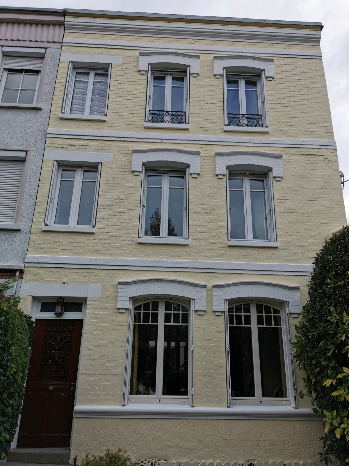 Pour commencer nous avons montè l'échafaudage sur toute la hauteur, fixation avec vérin. Lavage haute-pression sur toute la façade, réparation des Lintots de fenêtre avec un mortier extérieur Fibarex. Réfection de quelques joints de briques, application d'une couche fixateur acrylique et une finition en deux couches pliolite. Pour les volets métallique du rez-de-chaussée, nous avons procédé à un lessivage, rinçage, ponçage puis application d'une couche anti-rouille et une finition laque brillante. La porte d'entrée a été mise en peinture en 2 couches finition satinée. Pour finir démontage de l'échafaudage nettoyage fin de chantier et réception avec le client.
