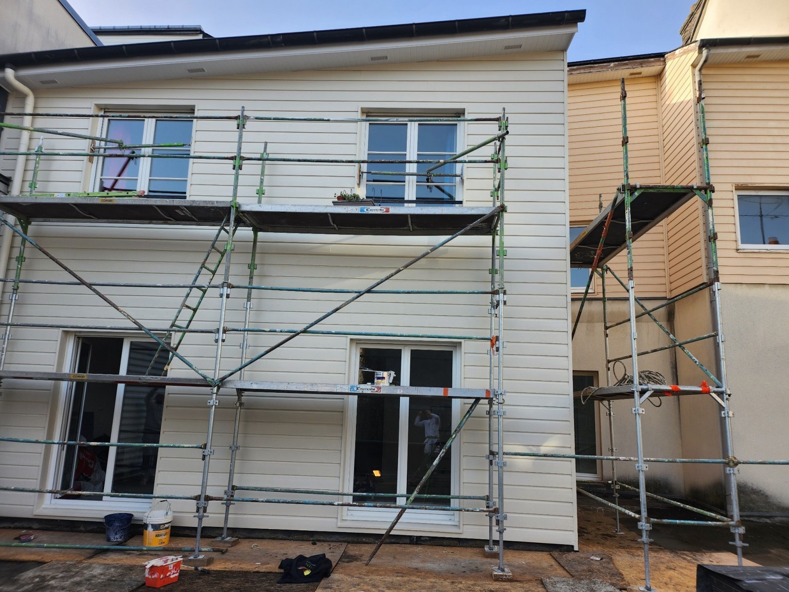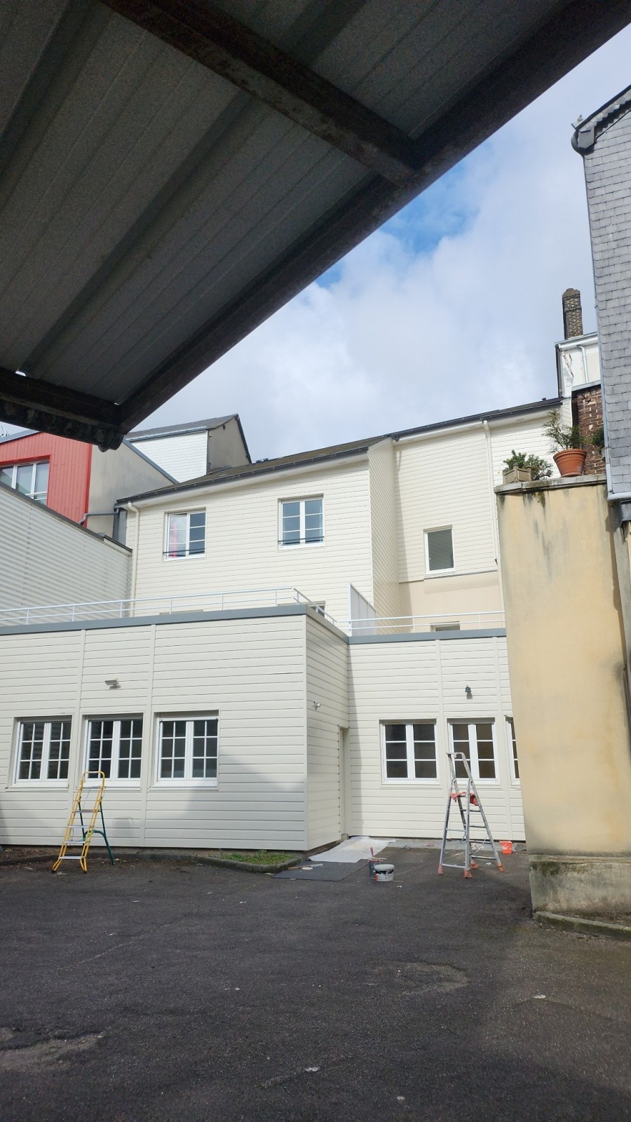 Travaux de peinture extérieure sur la commune de Rouen. Pour commencer nous avons protégé la terrasse puis monter un échafaudage.