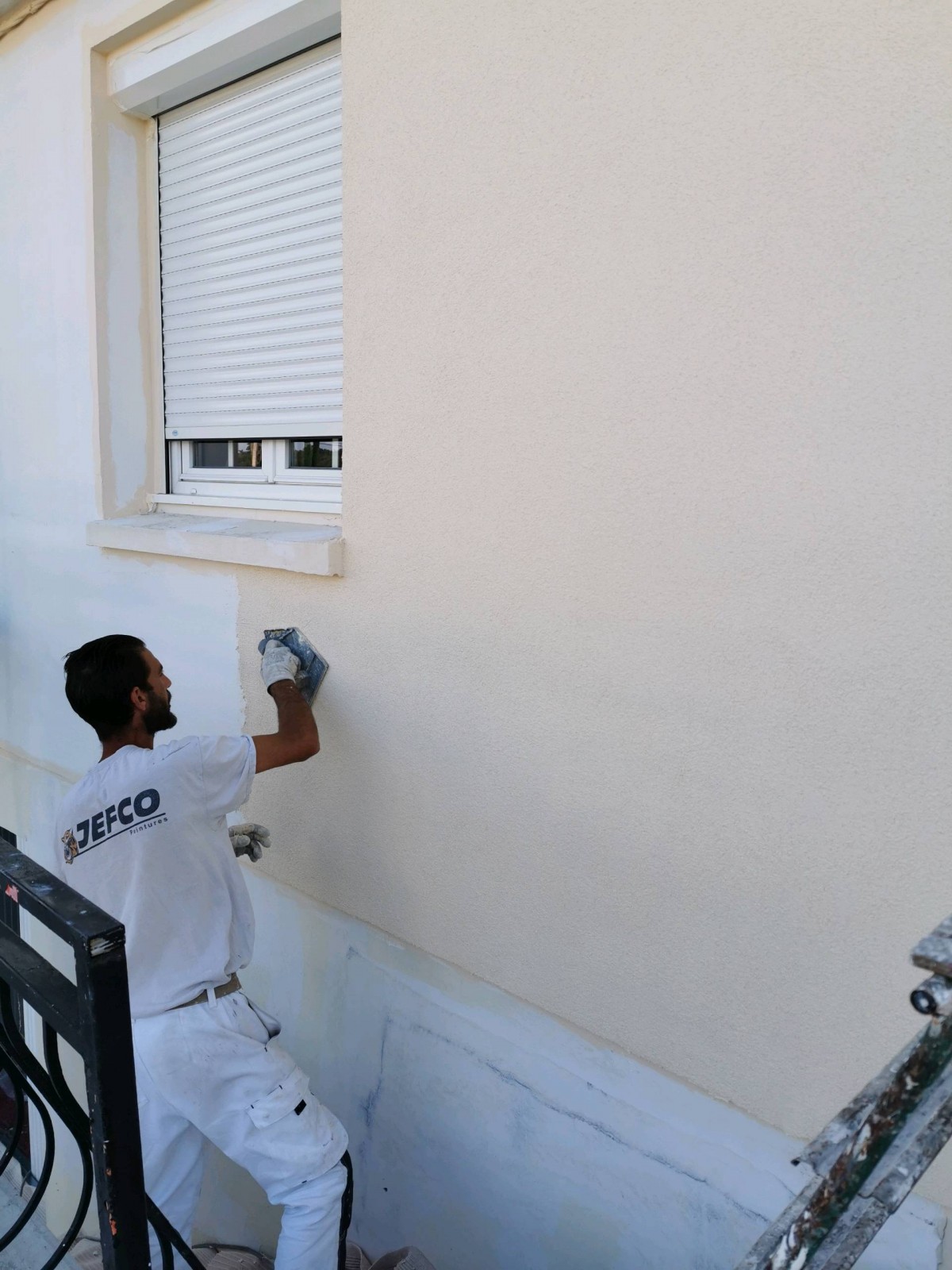 Pour commencer notre entreprise à commencè par la protection des menuiseries et des abords. Décapage complet de l'ancienne peinture avec une machine à raboter et aspiration. Lavage de la façade, rebouchage de toutes les fissures, application d'une couche de fixateur, finition avec un enduittalochè teintè (grain 21) de chez Jefco, mise peinture des caches moineaux et des appuis de fenêtre après préparation des supports.