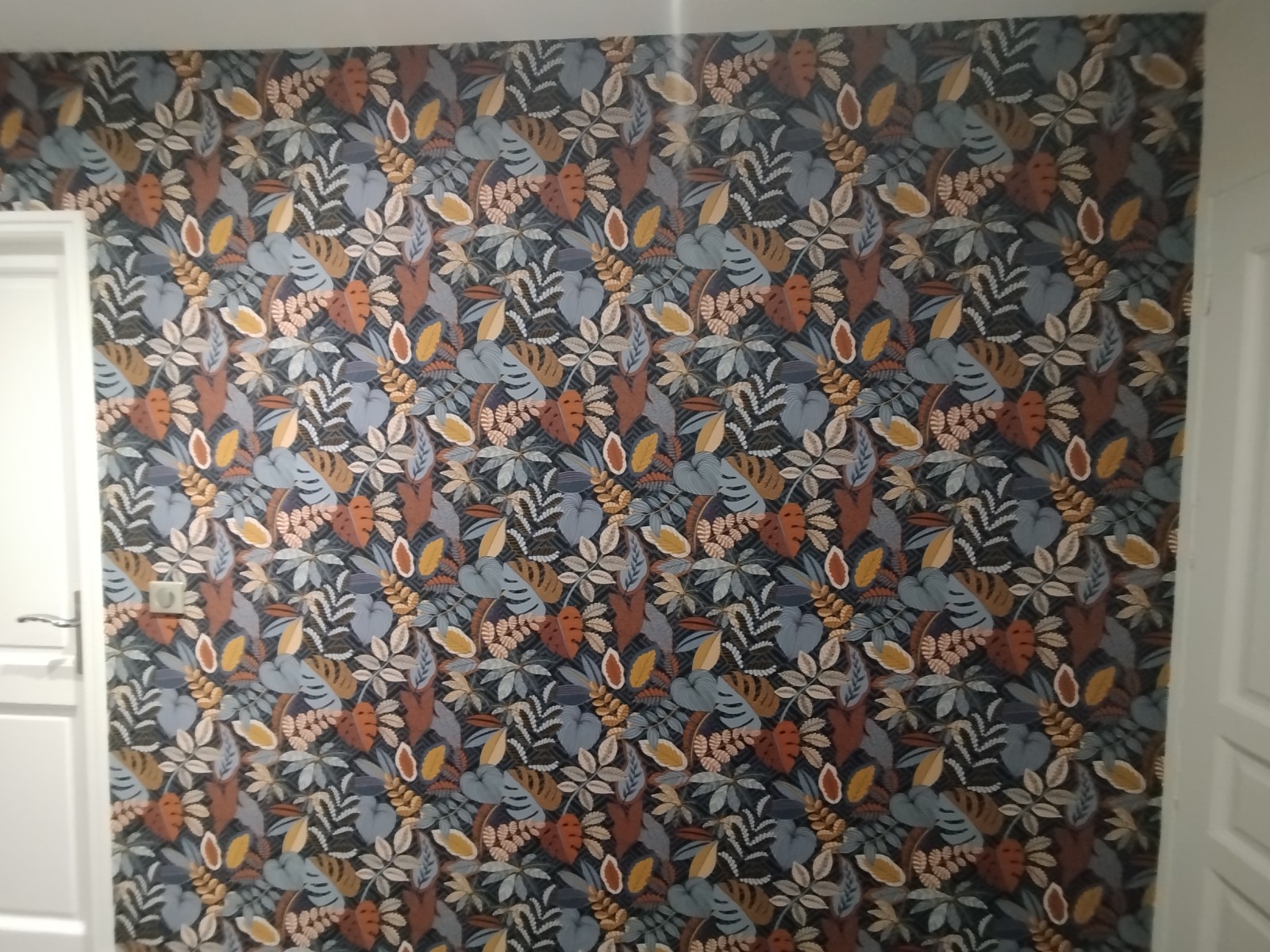 Pour commencer nous avons protégé le revêtement de sol existant. Décollage du papier peint, lessivage de la colle grattage rebouchage ponçage, pose de papier peint sur un mur.