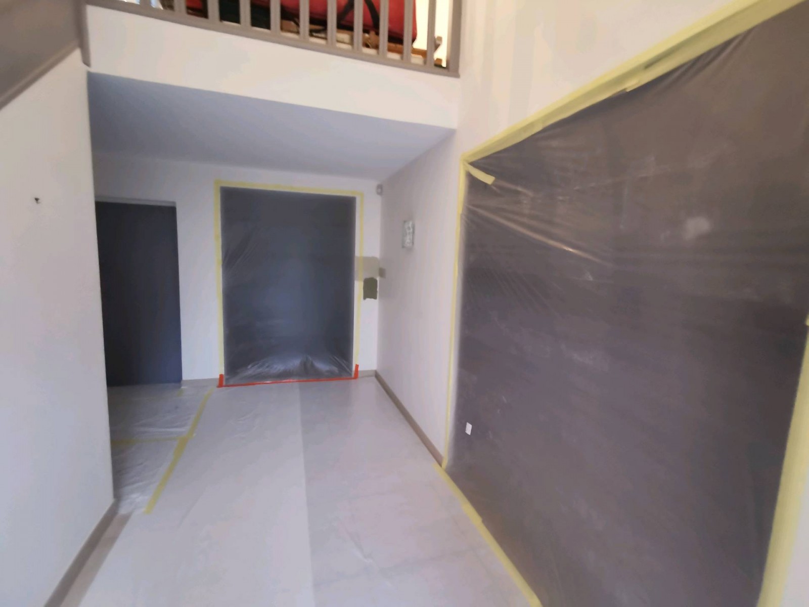 protection du sol et et des meubles restants. Lessivage, ponçage machine, 2 passes d'enduit sur les murs. Application d'une couche d'impression et de 2 couches peinture finition velours en 2 tons. Mise en peinture du garde corps et limont d'escalier . Pour le plafond: préparation du support, application de deux couches finition mat. Pose d'un papier peint décoratif. Nettoyage fin de chantier.
